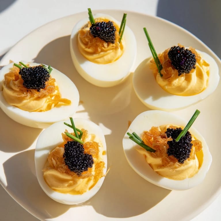 Pin it There's something about deviled eggs that transforms a simple appetizer into theater. I discovered this version at a gallery opening where everything felt understated until the tray arrived—suddenly people gravitated toward those golden halves crowned with dark jewels of caviar and crackling shallots. The contrast of creamy yolk against crispy texture and briny caviar made me realize how a classic dish could whisper elegance instead of shouting it.