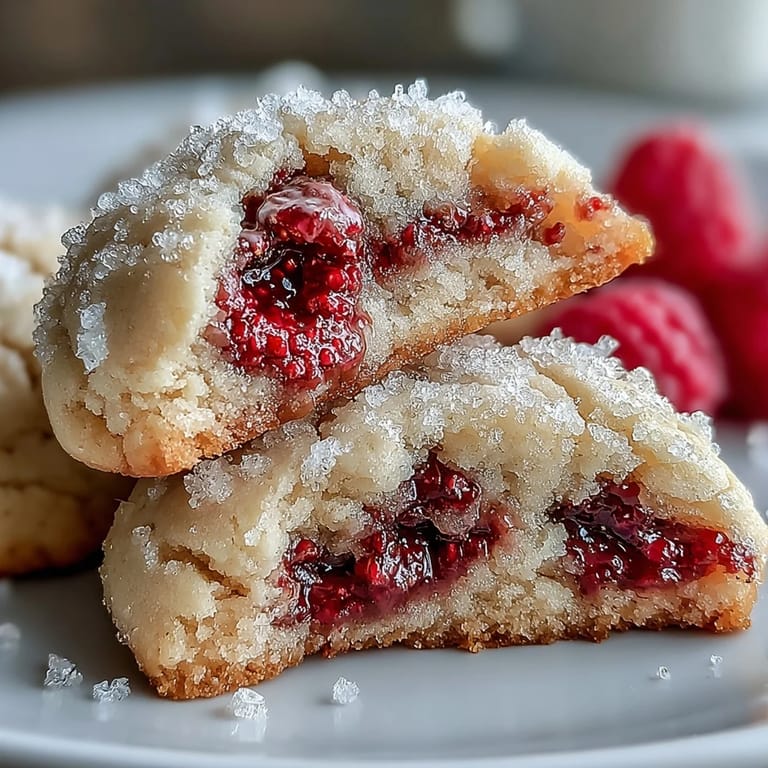 For an extra burst of raspberry in every bite, press a tiny spoonful of raspberry jam into the center of each dough ball before rolling it in sugar. The jam melts into the cookie as it bakes and creates a hidden pocket of sweetness. I also like to use a mix of fresh and freeze-dried raspberries in the dough itself when fresh berries are out of season or too expensive.