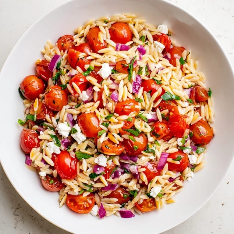 - Add the cooled orzo, halved tomatoes, diced red onion, crumbled feta, basil, and parsley to the bowl with the dressing. Toss everything together with a light hand—you want to coat it all evenly without crushing the tomatoes or breaking up the cheese too much.